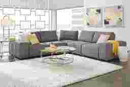 The Laney Park sectional is packed with features meant to enhance your lounging experience. Each oversized seat has a smooth adjusting back mechanism for customizable seat depth, making it the perfect place for entertaining friends or relaxing with family. Contemporary and stylish, the dark gray color and flat woven textured fabric are enhanced with clean, tailored lines. 100% Polyester.