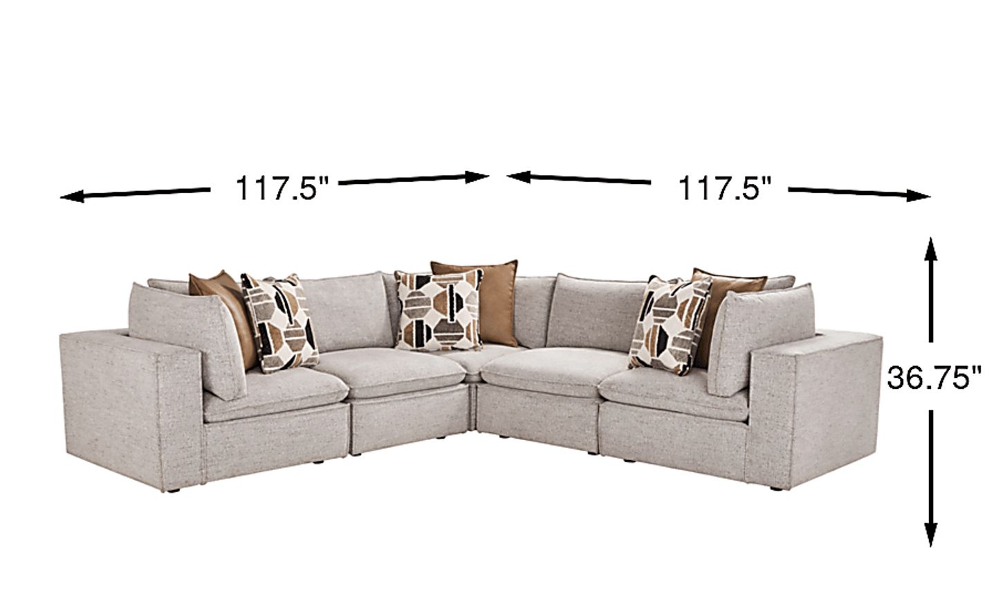 With a sweeping sense of relaxation and a sophisticated undertone of class, the Langford Park sectional turns any room into your favorite space for quiet contemplation, intimate gatherings or entertaining central. Transitional in style, this modular sectional features individual pieces with 360-degree upholstery for your endless rearrangement pleasure. Plush, woven chenille in beige is joined by jacquard pillows that add a special splash of color and style. Feather-blend seat and back cushions provide ample room for relaxation while the attached seat cushions lend an elevated sense of the serene. Non-skid legs keep everything just as you like it. Three corner chairs, two armless chairs. Plush woven chenille.
