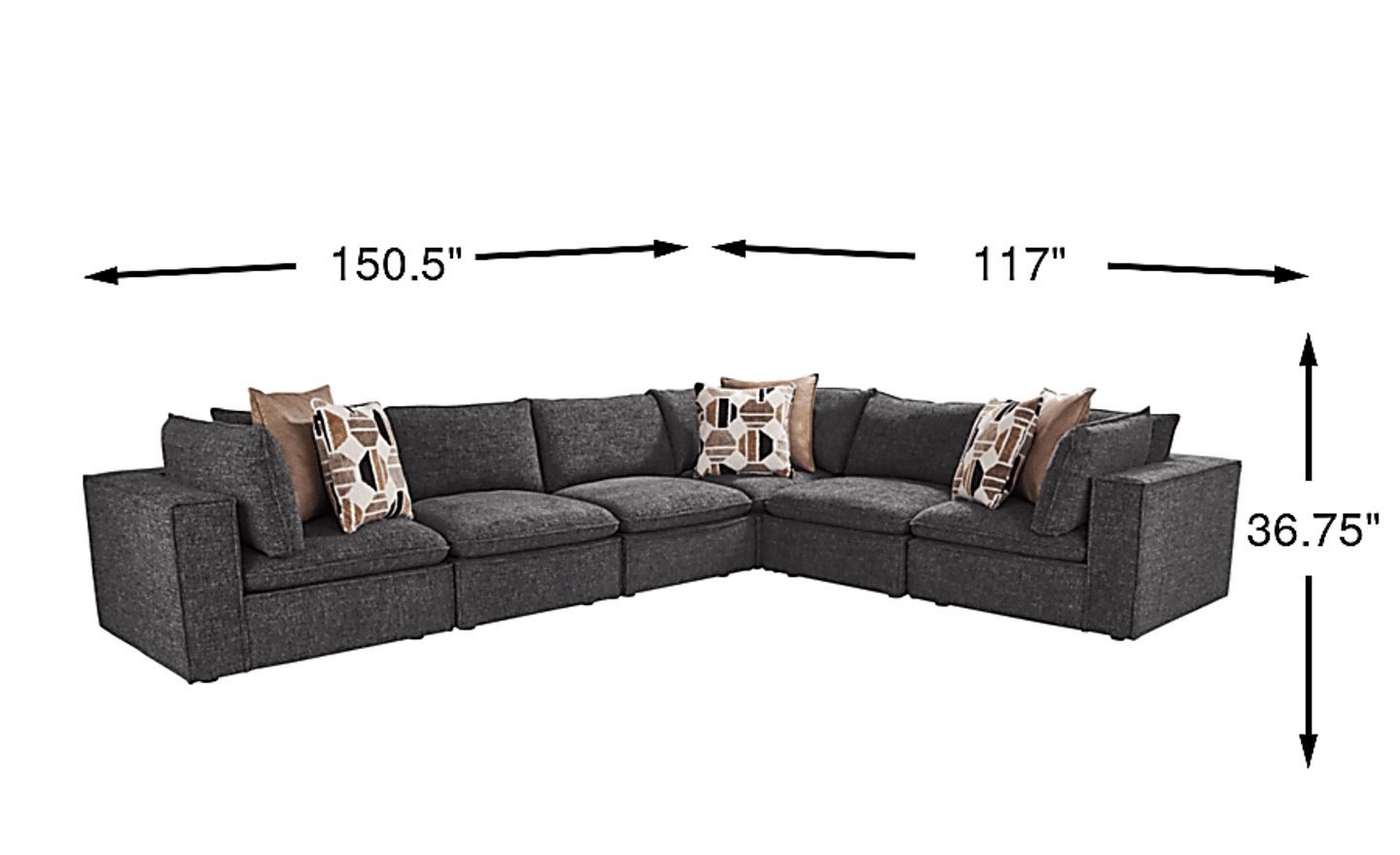 With a sweeping sense of relaxation and a sophisticated undertone of class, the Langford Park sectional turns any room into your favorite space for quiet contemplation, intimate gatherings or entertaining central. Transitional in style, this modular sectional features individual pieces with 360-degree upholstery for your endless rearrangement pleasure. Plush, woven chenille in charcoal is joined by jacquard pillows that add a special splash of color and style. Feather-blend seat and back cushions provide ample room for relaxation while the attached seat cushions lend an elevated sense of the serene. Non-skid legs keep everything just as you like it. Three corner chairs and three armless chairs. Upholstery: 100% Polyester.