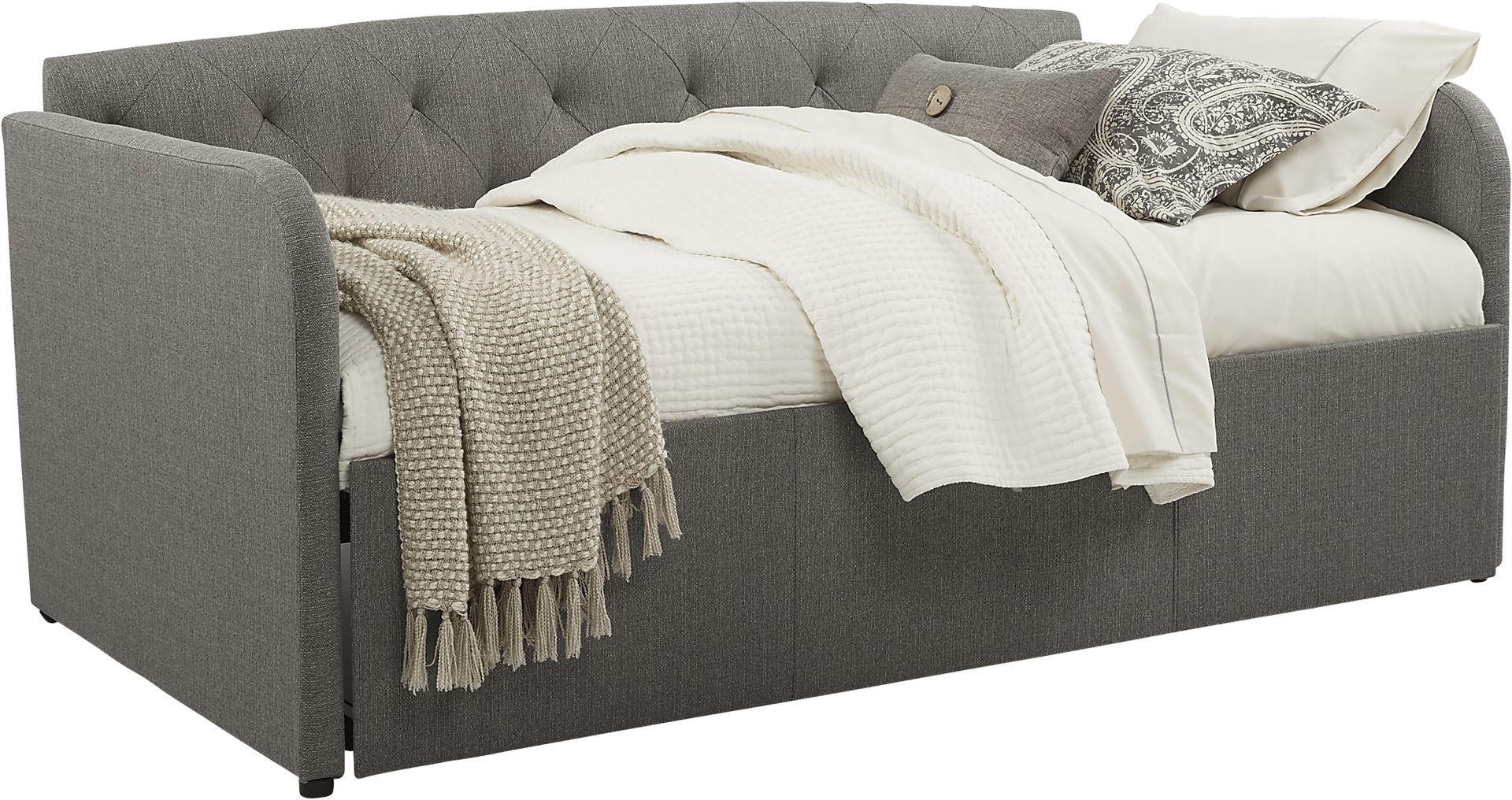 Turn any room into a guest room with the space saving Lanie daybed. Offering excellent value, the daybed is upholstered in on-trend gray fabric with classic tufting detail. So, whether used by an overnight guest, or for a quick nap, this is a multi-functional piece you'll be glad to have on hand. Mattress sold separately. Trundle not included.