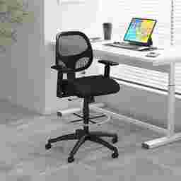 This Lanndis commercial grade mesh back stool has an attractive linear mesh material back which helps to prevent heat buildup.The back design is constructed to allow for generous lumbar support. This chair features a thick high density foam seat that is upholstered with premium mesh material for contract styling and quality. It includes a pneumatic gas lift seat height adjustment, a 25-inch black nylon base and hooded double wheel casters and a chrome footing. Customer assembly is required.