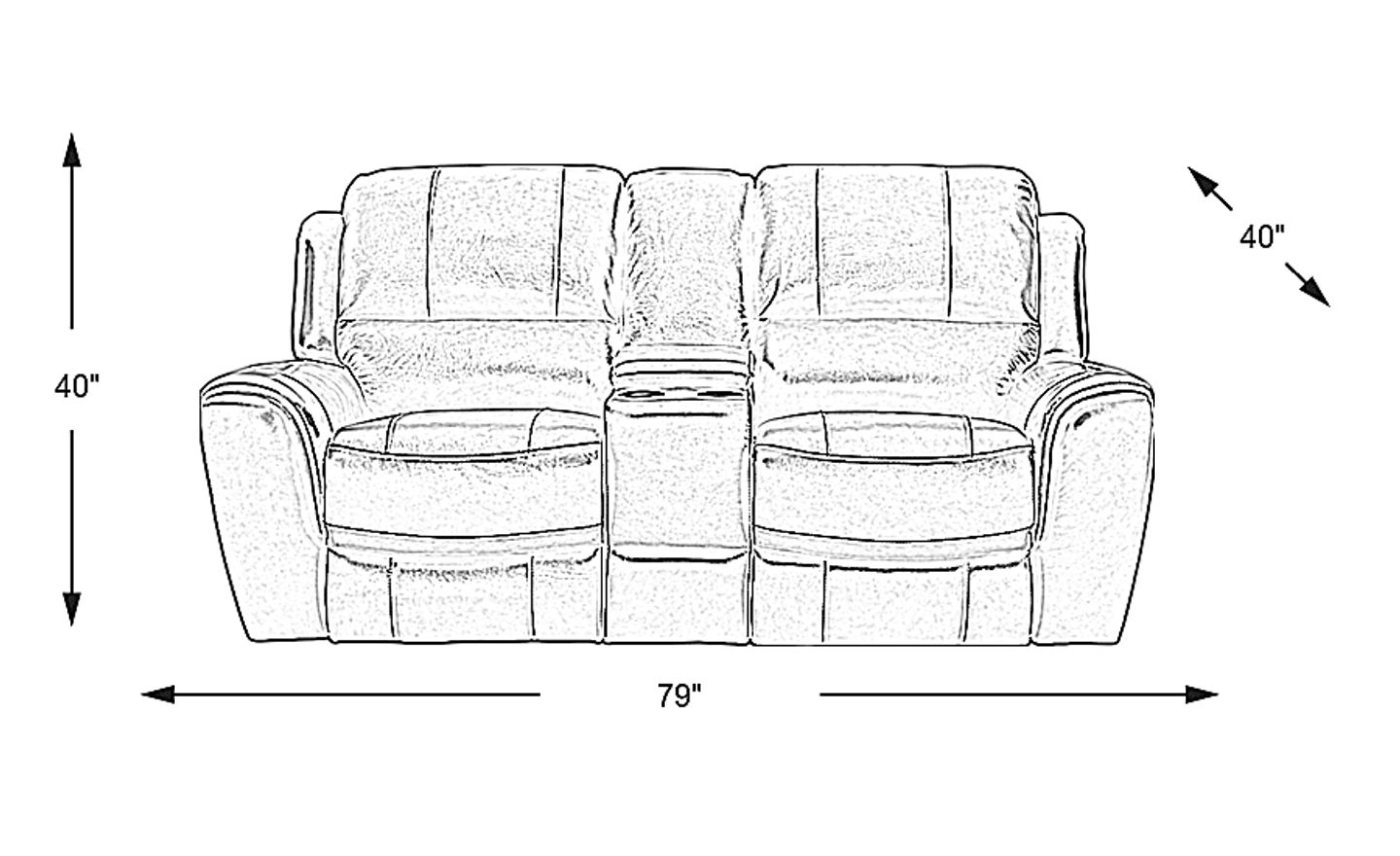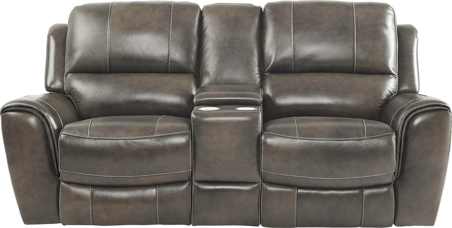 Two can easily indulge in the comfort of luxurious top grain leather where the body touches with the gray Lanzo reclining console loveseat. Power Plus recliners on each end extend at the push of a button, allowing you to stop or start at any desired position. Adjustable headrests are ultra-plush, providing optimum neck and head support as you read, watch TV, or relax. A center console features hidden storage and two cupholders, while multiple USB ports add even more convenience to this exceptional loveseat. 24" extension when footrest is fully reclined. Allow 3" for wall spacing. Top grain leather where the body touches and vinyl sides and backs.