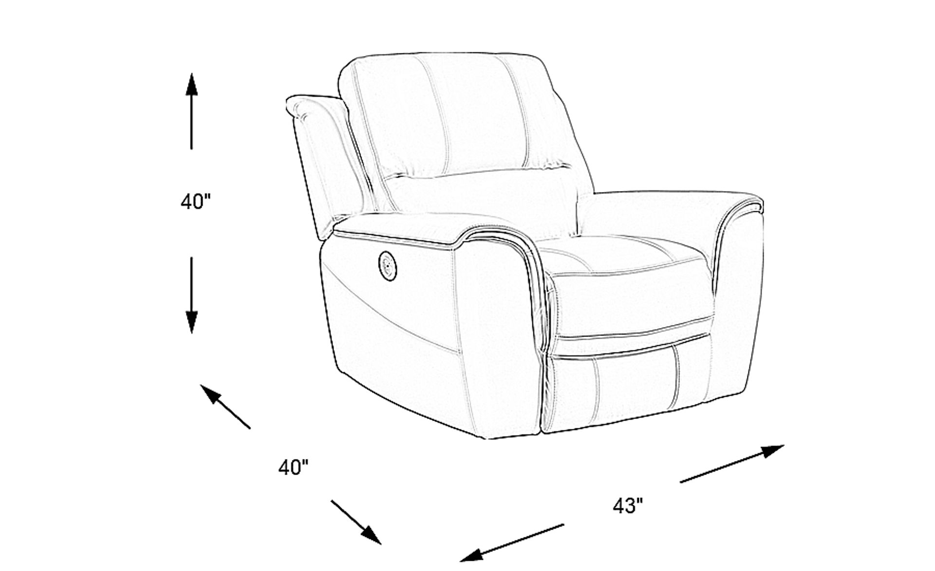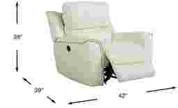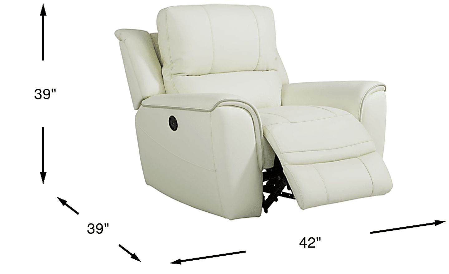 Upholstered in off-white top grain leather where the body touches, the Lanzo recliner's sleek lines and comfortable reclining ability are bound to make it your new favorite place to relax. The dual power mechanism extends at the push of a button, allowing you to stop or start at any desired position. An adjustable headrest is ultra-plush, providing optimum neck and head support as you read, watch TV, or relax. A USB port is a convenient touch, letting you plug in and charge smartphones, tablets, and much more. With its winning combination of comfort, quality, and value, this recliner is an excellent choice for your living area. 26" extension when footrest is fully reclined. Allow 5" for wall spacing. Top grain leather where the body touches and polyurethane fabric sides and backs.