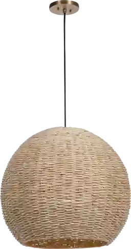 Woven seagrass, a natural renewable and sustainable material, in a dome shape around a metal frame with slight antique brass accents give the Larch Bay pendant textured warmth bringing nature inside. Professional installation by an electrician recommended.