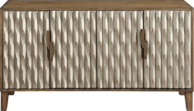 Stunning door fronts have a unique fluted textured design that gleam in a shimmery metallic splendor against the framework on this outstanding four door Largin credenza. A masterpiece of design that will not only be a focal point in your decor, but with such a spacious shelved interior complete with a cord management system, will be the perfect selection for you and your home. Customer assembly is required.