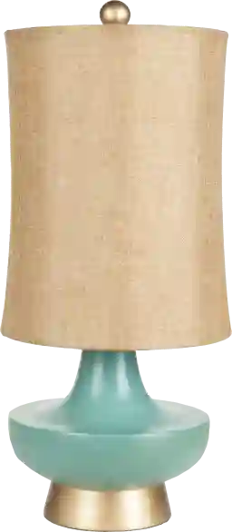 The Lark Bend lamp offers an enduring presentation of traditional form that will competently revitalize your decor space. This lamp is expertly crafted with an aqua hand finished composition body camel linen shade and a hand finished painted composition gold base. Partial assembly may be required.