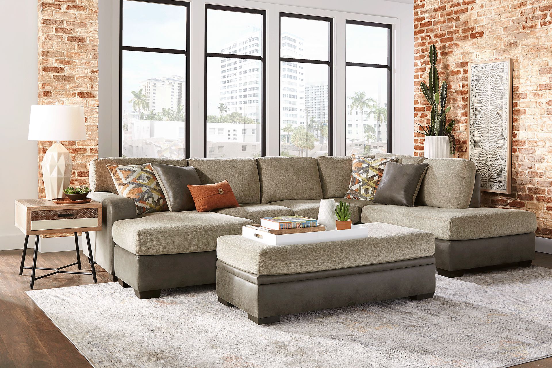Uniquely designed, the Larna Park sectional's casual style cultivates the perfect atmosphere for your gathering area. Upholstered in taupe-colored woven fabric, its soft cushions contrast with the smooth brown base for a bold, striking look. This spacious sectional includes two chaises, adding more room for the entire family. Accent pillows, included, bear a vibrant geometric pattern and solid fabric to match the base and track arm. Loose seat cushions help extend the lifetime of your sectional so you can enjoy it longer. Upholstery: 100% Polyester.