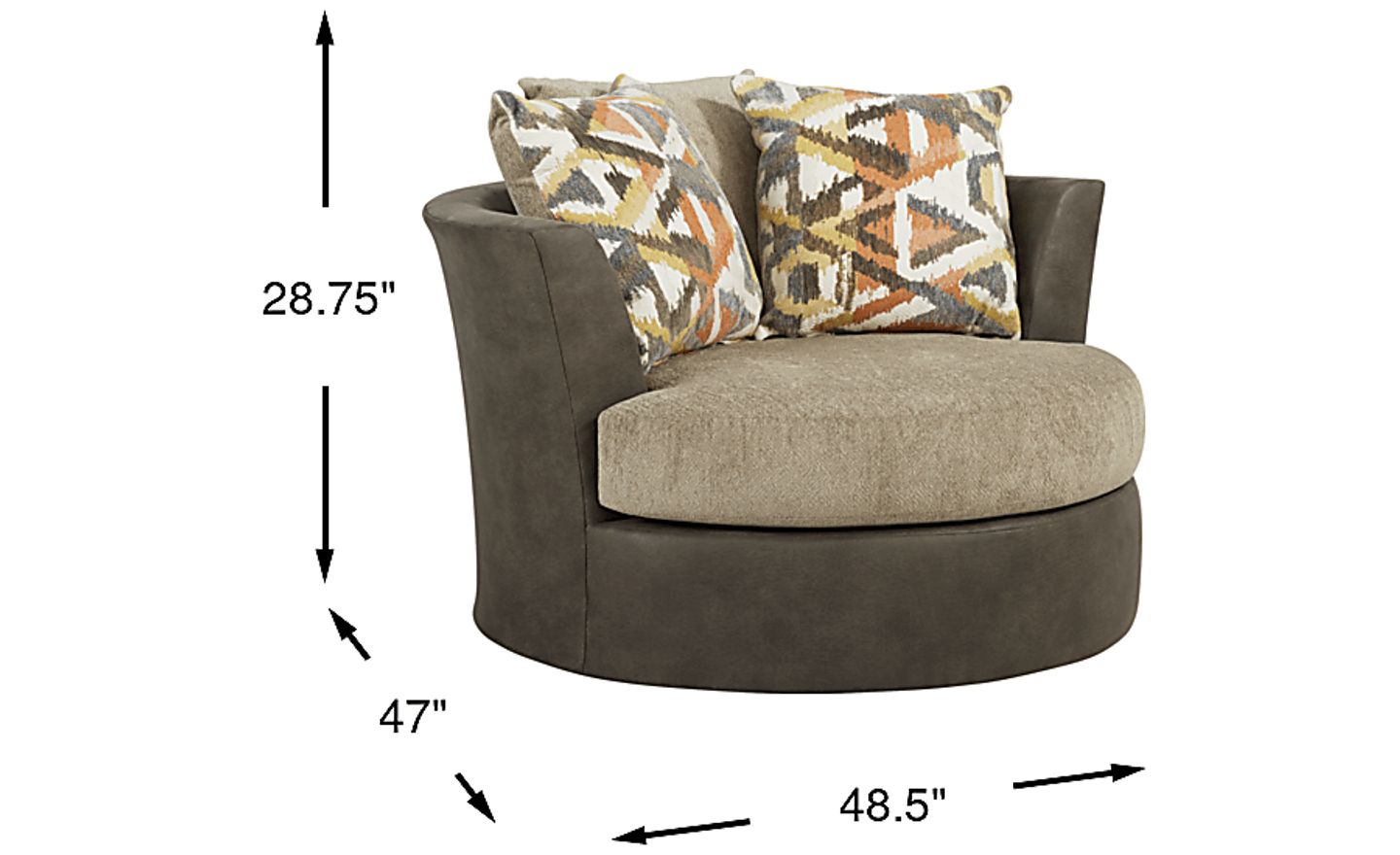 Elevate your room's comfort and style with the Larna Park swivel chair. Upholstered in taupe-colored woven fabric, its soft cushion contrasts with the smooth brown base for a bold, striking look. Accent pillows, included, bear a vibrant geometric pattern that adds color to the piece. A loose seat cushion helps extend the lifetime of your chair so you can enjoy it longer. Plus, the swivel feature allows you to easily rotate at your convenience. Upholstery: 100% Polyester.