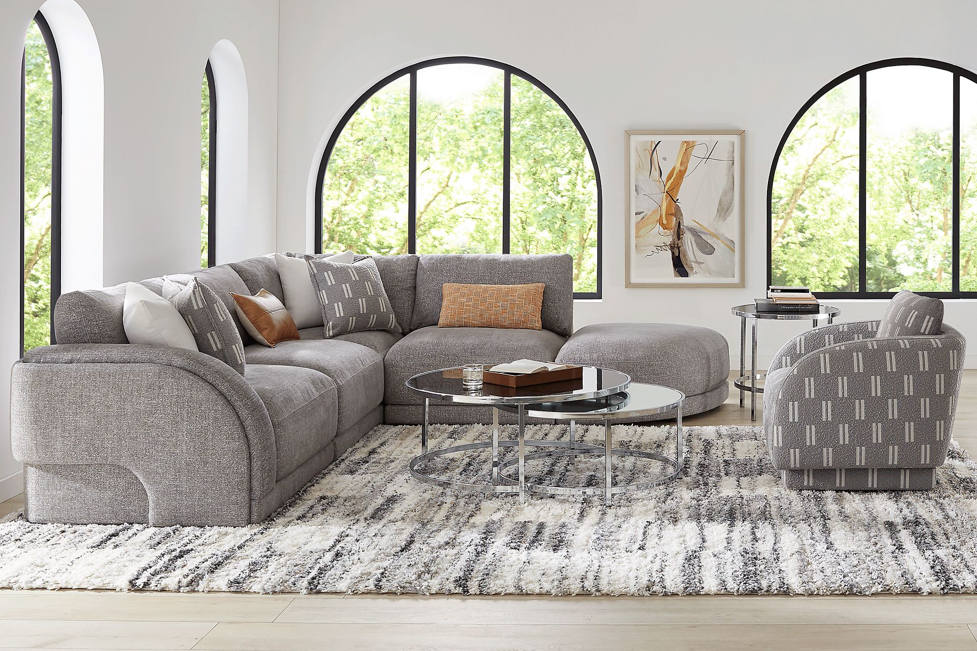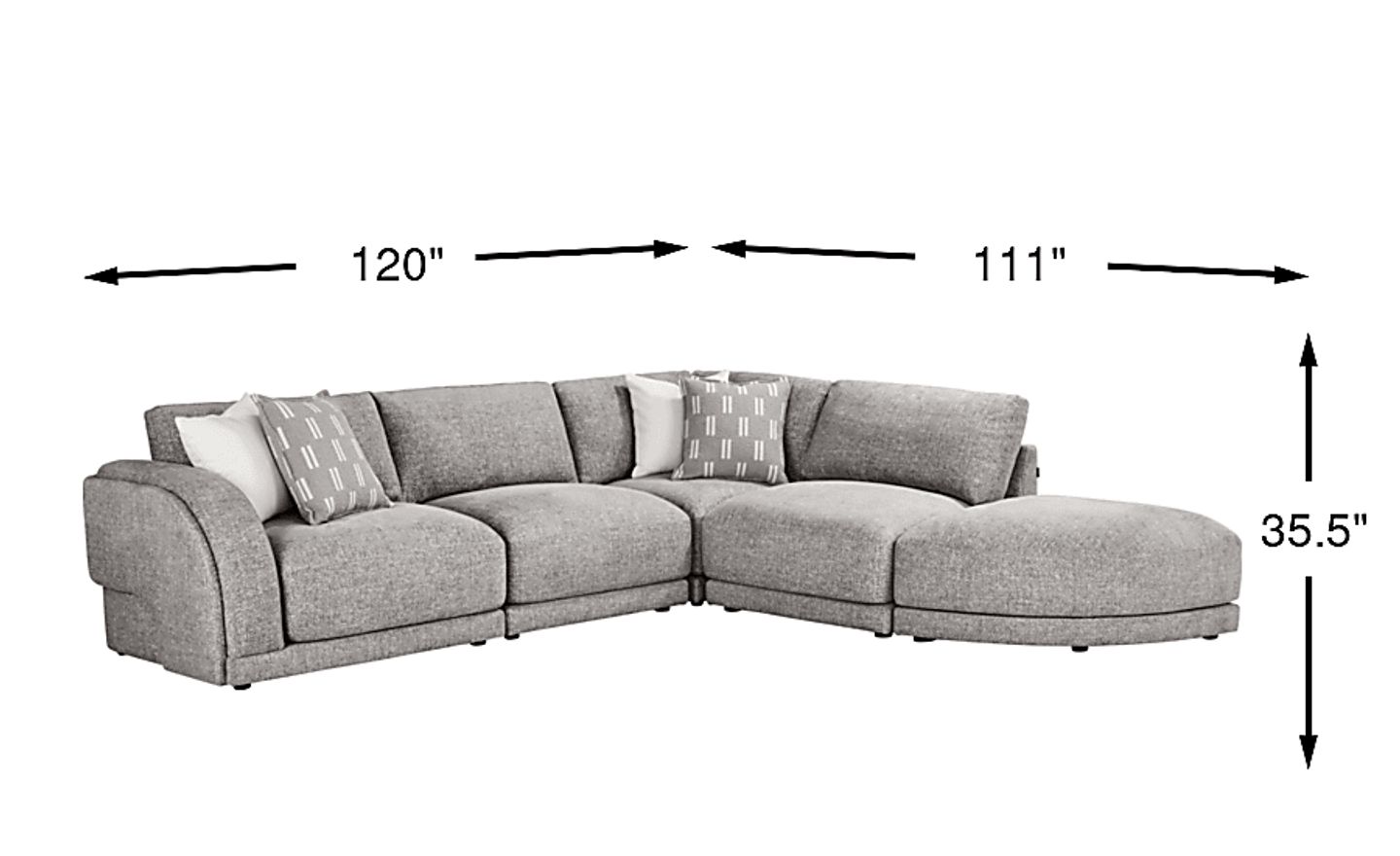 Effortlessly cool and casual, the Latham Court modular sectional lends its inviting nature to movie nights and midweek relaxation alike. Upholstered in woven gray fabric with gentle organic curves, this collection features individual seats and pieces that can be separated and recombined to fit every occasion. Distinctive radius arms feature arched wraparound details that reach from the base and sides to the back of each seat. Overstuffed seat cushions and gently sloped back cushions support a naturally relaxing sitting posture. Included is a pie-shaped accent ottoman that adds an extra seat or footrest to this piece's stunning silhouette. Upholstery: 100% polyester.