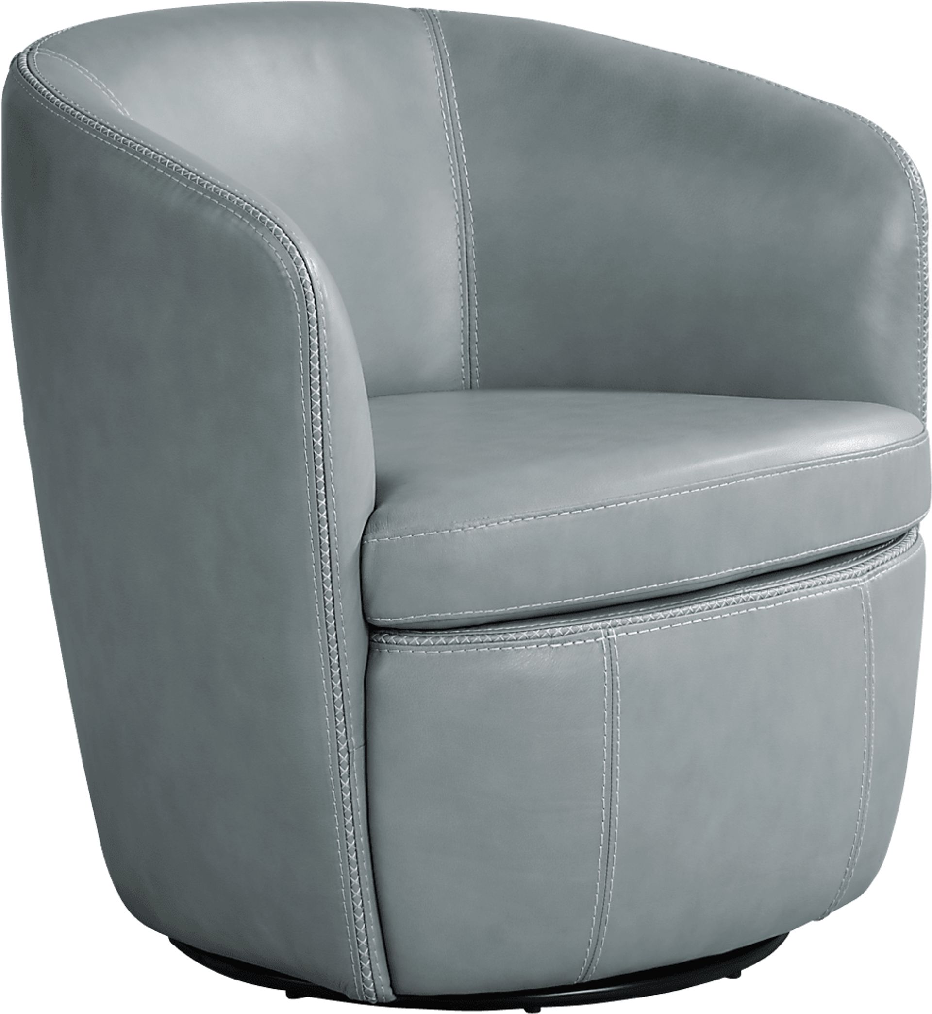 The sleek curvature and chic styling of the Laumont swivel chair adds a touch of class to any living space. Upholstered in top grain leather where the body touches, this modern piece includes a 365-swivel base for ease of movement and change of view. Curved padded arms are accompanied by full foam padding covering the frame for added comfort and visual appeal, while an intricate moccasin stitch adds a touch of glamor. Three color offerings make it a great addition to either existing sets or as a stand-alone piece.