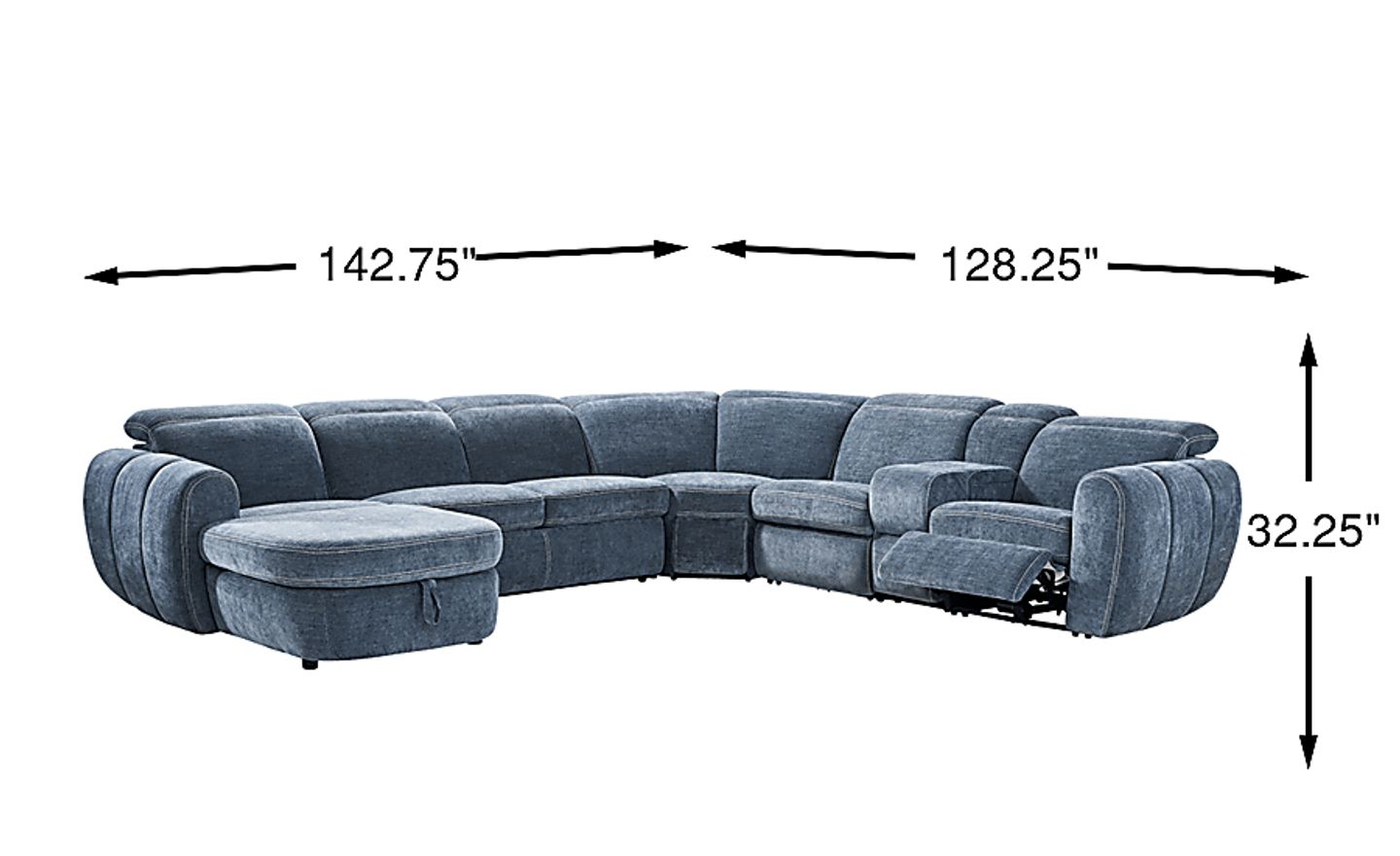 Generous in scale and rich in comfort, the Laurel Heights sectional transforms everyday lounging into an experience of relaxation and connection. Upholstered in blue woven fabric, this sectional comfortably seats up to six people. Three of the seats recline at the touch of a button, allowing you and your guests to easily kick back with power adjustable headrests and chaise-style footrests. Perfect for stowing away blankets or pillows, the chaise opens to reveal hidden storage. A pop-up sleeper in the center conveniently accommodates overnight stays. Designed for customized comfort, the ratchet-style headrests of the non-power seats are manually adjustable. Two hidden cupholders and a lift-top compartment in the console offer space to keep drinks and other items close at hand. Top stitched seams add texture and a touch of detail, while tailored mailbox arms lend a plush feel. Upholstery: 100% Polyester.