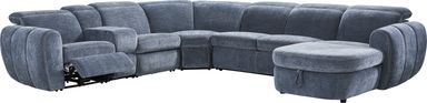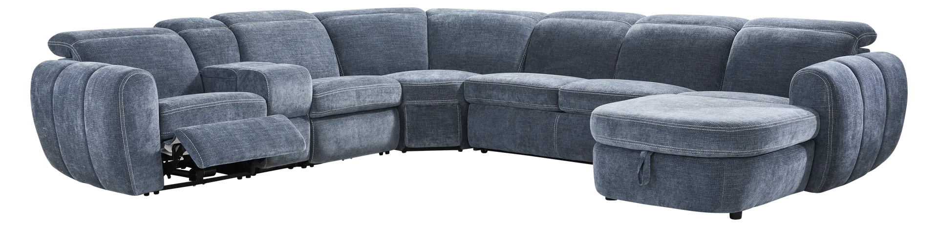 Generous in scale and rich in comfort, the Laurel Heights sectional transforms everyday lounging into an experience of relaxation and connection. Upholstered in blue woven fabric, this sectional comfortably seats up to six people. Three of the seats recline at the touch of a button, allowing you and your guests to easily kick back with power adjustable headrests and chaise-style footrests. Perfect for stowing away blankets or pillows, the chaise opens to reveal hidden storage. A pop-up sleeper in the center conveniently accommodates overnight stays. Designed for customized comfort, the ratchet-style headrests of the non-power seats are manually adjustable. Two hidden cupholders and a lift-top compartment in the console offer space to keep drinks and other items close at hand. Top stitched seams add texture and a touch of detail, while tailored mailbox arms lend a plush feel. Upholstery: 100% Polyester.