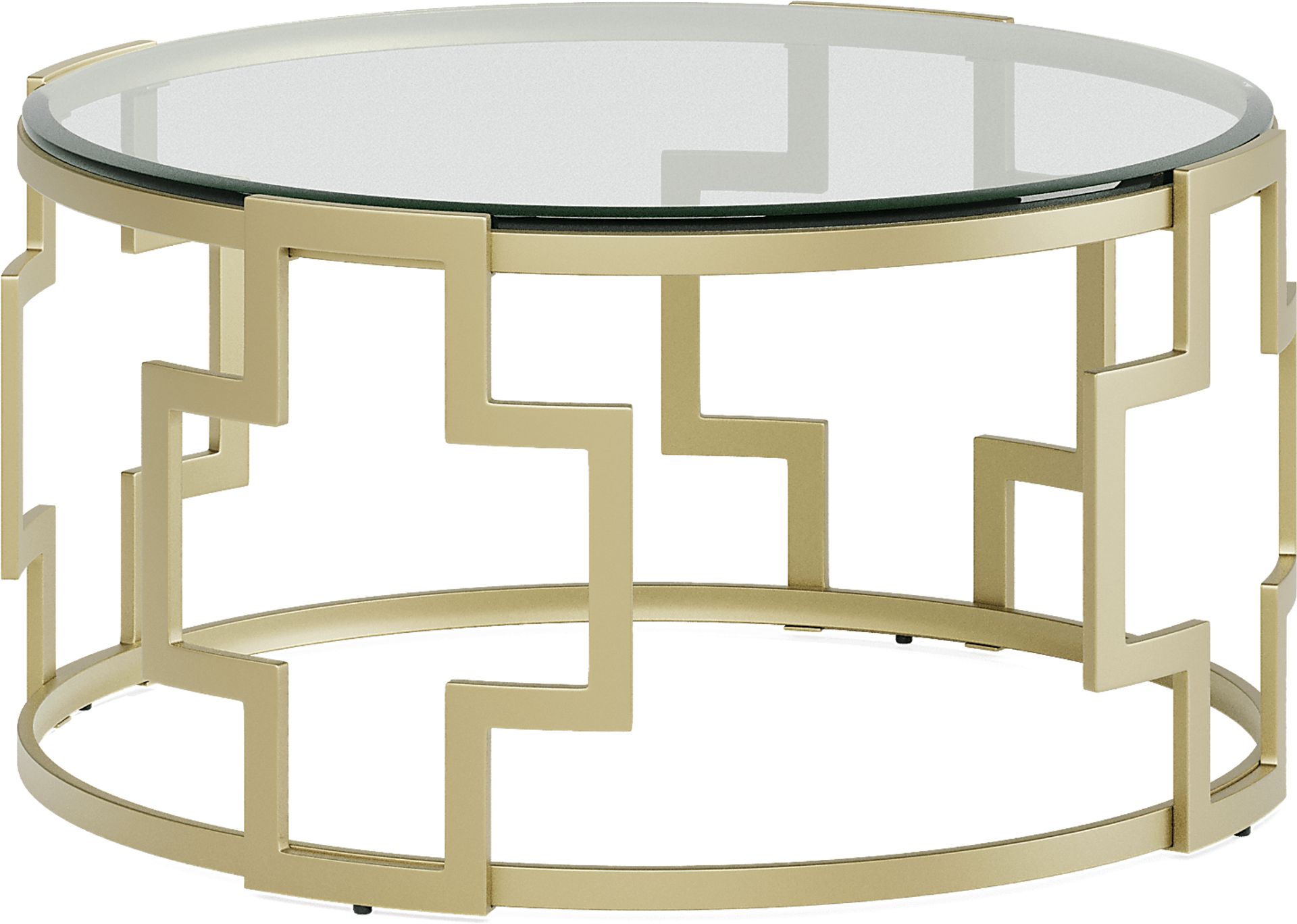 Boasting modern style, the Laurier Park cocktail table creates a chic centerpiece for your living room. The metal base, featuring a gold finish, forms a geometric pattern of cross shapes. Tempered and beveled, its round glass top offers a sense of sophistication and elegance. This table is the perfect size for placing a few drinks or your favorite magazines.