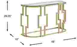 Select the gorgeous Laurier Park sofa table to add contemporary style to your space. The metal base, featuring a gold finish, forms a geometric pattern of cross shapes. Tempered and beveled, its glass top offers a sense of sophistication and elegance. This long, narrow table is designed to stand behind your sofa as a convenient place to set drinks, remotes and other entertaining essentials.