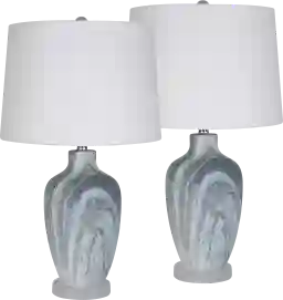 The beautiful blue and grey Lavonne Spring table lamp is a great addition to any room. Featuring a frosted base, white linen shade, 3-way switch and "blown glass" look. Comes as a set of 2, perfectly paired for any room! Customer assembly required.