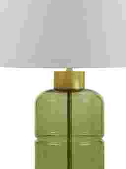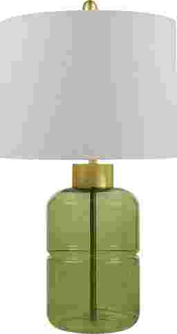 The Lawton View Green Lamp, seamlessly blending elegance and contemporary allure. Crafted from captivating green glass, it transitions effortlessly between aesthetics, perfect for any living room or bedroom. Enhanced with striking gold metal accents and a linen-colored drum shade with a gold finial, this lamp exudes sophistication. Elevate your space with this exquisite lamp, seamlessly blending style and functionality. Partial assembly may be required.
