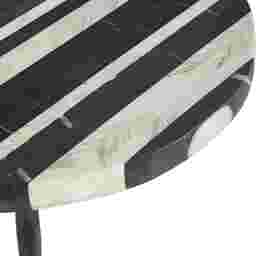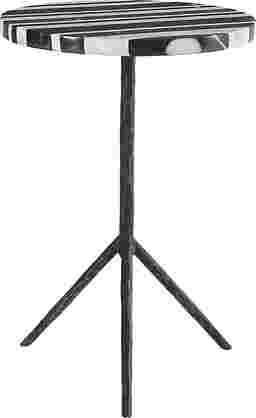 A unique blend of classic and modern details, this round Laythan accent table showcases an asymmetrically striped black and white marble top over a chiseled iron tripod base in a naturally distressed aged iron finish. True to the nature of natural materials, each piece will have unique marbling and veining throughout. Customer assembly is required.