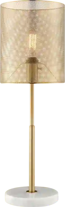 The Leander Cay Gold Lamp in a lustrous gold finish evokes timeless elegance and sophistication. The mesh drum metal shade boasts a vintage-inspired design, accentuated by the striking Edison bulb, adding a touch of mid-century charm to any space. The sturdy white marble base provides a stable foundation, making it a perfect lighting solution for any décor. This lamp is a stunning statement piece that effortlessly blends form and function, illuminating your home with a warm, inviting glow while elevating your decor to new heights. Partial assembly may be required.