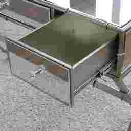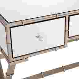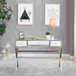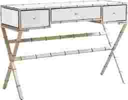 Thrice the storage. With this mirrored Leander console table, reflect your decor while solving storage woes. Regency inspired faux bamboo metal legs loft three drawers and tabletop to airy architecture. Accommodating surface welcomes everything from pictures to floral arrangements and makeup mirrors. Liven up your living room with this glam console table behind the sofa, or place in the dressing area for an eclectic chic vanity. Customer assembly required.