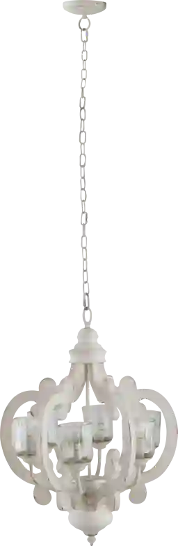 With an intricate design, distressed white finish, and glass bulb covers, the Leda Post chandelier radiates warm light in timeless, sophisticated style. Classic curves and neutral color combine to make this piece a versatile, eye-catching light fixture. Let this piece bring a vintage appeal to an entryway, master bathroom or dining room. Professional installation by an electrician is recommended.