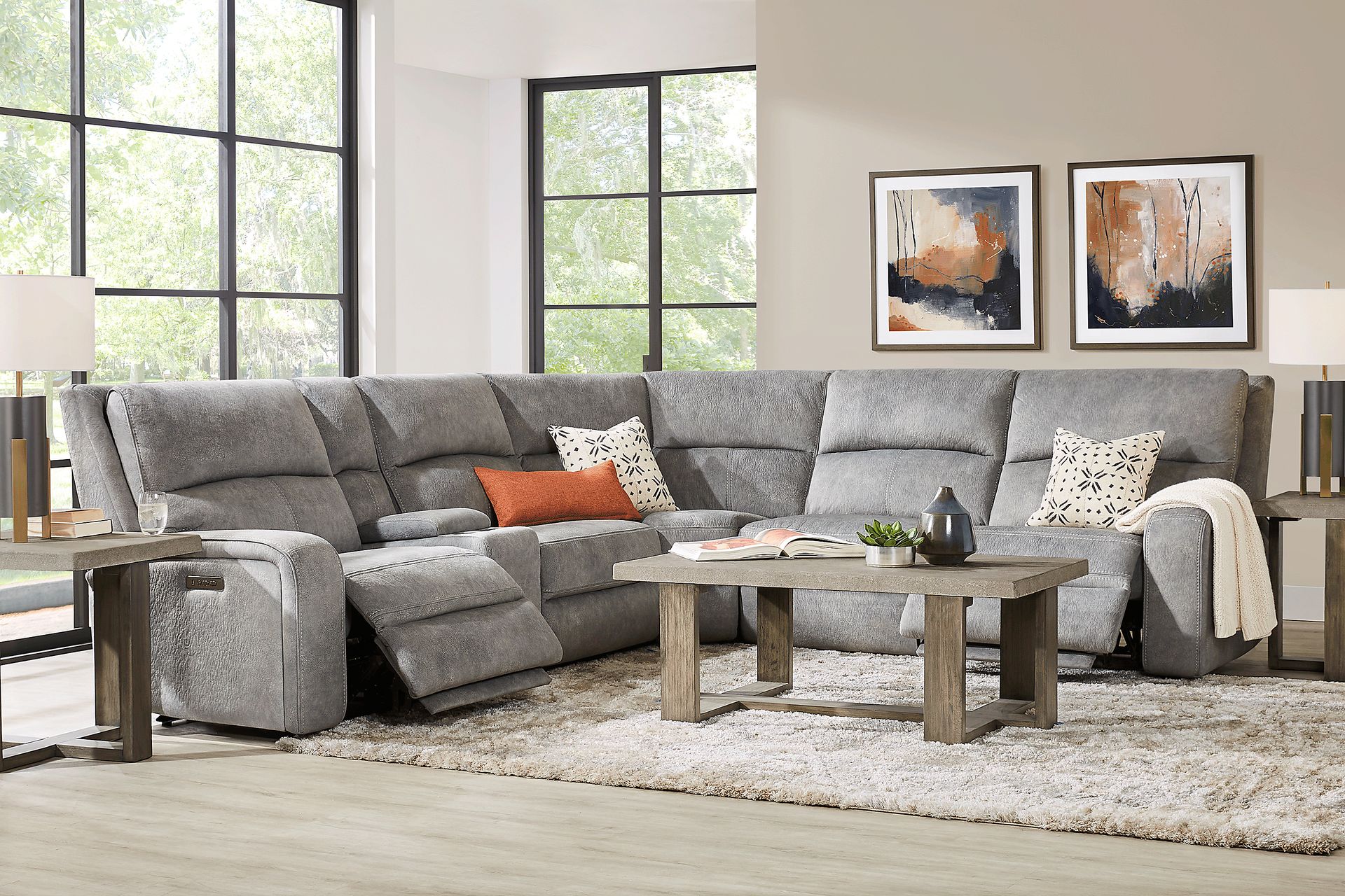 Relaxation never goes out of style with the Leighton reclining sectional. The transitional sectional's gray microfiber upholstery sports a clean, contemporary look for your living room, while the tall back presents a large silhouette accented by inset piping along the top arm. Padded on the outside arms and back, the framing offers solid construction and premium support for seating across the spacious body. Dual power reclining features invite you to sit back, relax, and enjoy a new level of comfort even as you charge your phone with one of the USB ports located on the outside arms of the sectional. A console provides extra storage and removable stainless steel cupholders for easy access to a cold drink for the big game or a glass of wine you poured for a night of binge watching. Upholstery: 100% Polyester