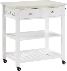 Capturing the classic charm of the modern farmhouse aesthetic, our Leski kitchen cart with decorative top, combines beauty and functionality. Its multifunctional design makes it perfect for serving, and kitchen storage. Beautiful from every angle, it features a solid wood painted finish, contrasted with the clean lines of faux marble top surface. Two handy drawers will hold all your cooking utensils. Mid-level open shelving area is ideal for displaying extra-large pots. Towel bar, utility hooks and heavy-duty hardware provide long lasting appeal. A must-have addition to any home, this charming kitchen cart is sure to be your new favorite place for both storage and dining. Customer assembly is required.