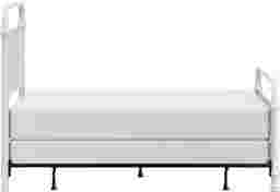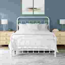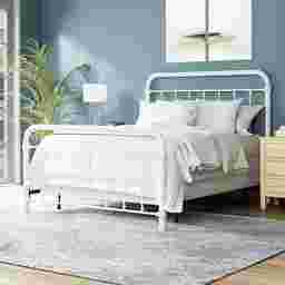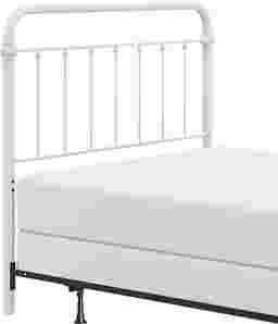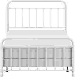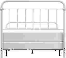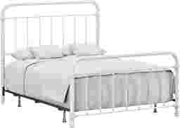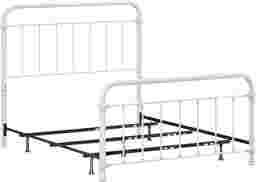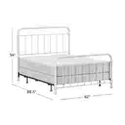 This Leveni queen-size metal bed adds a touch of vintage style to any bedroom, featuring castings and fittings that seamlessly complement its rounded square design. Elegant and trendy, the white finish is a versatile choice that fits into a wide variety of decor styles and color schemes. Includes headboard, footboard, and bed frame. Box spring and mattress required; not included. Customer assembly is required.