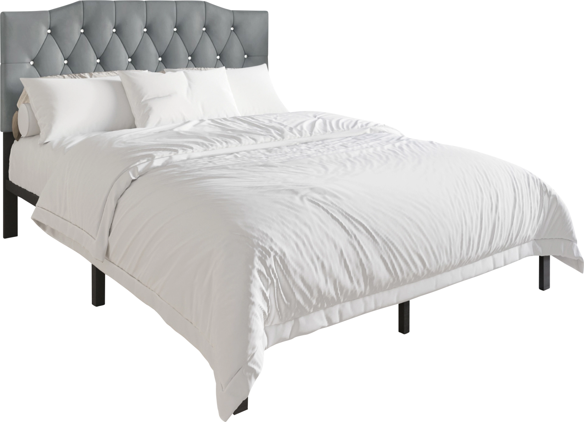 The headboard features a sophisticated diamond-stitched pattern accented with luxurious crystal button tufting. This combination of contemporary gray fabric and reflective crystal elements creates a modern, elegant aesthetic that serves as a high-end centerpiece for your bedroom decor.