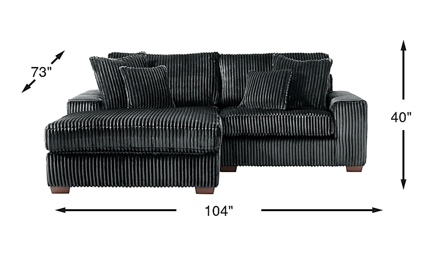 Runway inspiration meets unapologetic indulgence in Lexford Park, blending the poise of high-fashion with the ease of everyday relaxation. Tailored for sumptuous comfort, this sectional features a left arm facing chaise lounge and a right arm facing chair that create an arrangement full of balance and harmony with a generous depth of seating for one or more to unwind in style. Clad in ribbed black corduroy, low profile track arms cinch the look with a slight contemporary edge that adds a chic detail to the breathtaking silhouette. Reversible back and seat cushions make it easy to fluff up the sectional and make it as ready for a close-up as you are to relax. Upholstery: 100% Polyester. Cleaning Instructions: Use water-based cleaning agents or foam.