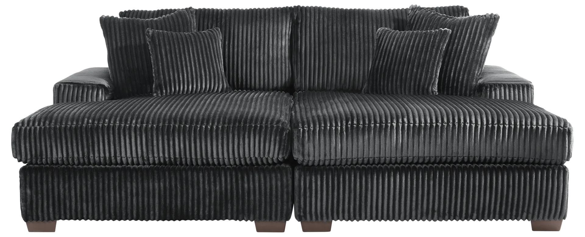 Runway inspiration meets unapologetic indulgence in Lexford Park, blending the poise of high-fashion with the ease of everyday relaxation. Clad in ribbed black corduroy, this sectional features a symmetrical pair of chaise lounges that meet at the center to form a sweetheart-inspired two-seater. Whether you're stretching out solo or sharing the moment, the generous seat depth offers plenty of room for one or more to sink into sumptuous comfort. Low profile track arms cinch the look with a slight contemporary edge that adds a chic detail to the breathtaking silhouette. Reversible back and seat cushions make it easy to fluff up the sectional and make it as ready for a close-up as you are to relax. Upholstery: 100% Polyester. Cleaning Instructions: Use water-based cleaning agents or foam.