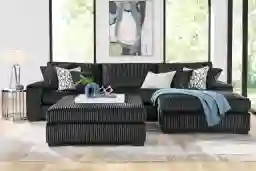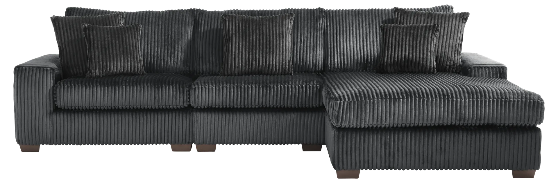 Runway inspiration meets unapologetic indulgence in Lexford Park, blending the poise of high-fashion with the ease of everyday relaxation. Tailored for sumptuous comfort, this sectional features a left arm facing chaise, an armless chair and a right arm facing chair that create an arrangement full of balance and harmony with a generous depth of seating for one or more to unwind in style. Clad in ribbed black corduroy, low profile track arms cinch the look with a slight contemporary edge that adds a chic detail to the breathtaking silhouette. Reversible back and seat cushions make it easy to fluff up the sectional and make it as ready for a close-up as you are to relax. Upholstery: 100% Polyester. Cleaning Instructions: Use water-based cleaning agents or foam. Accent pillows not included.