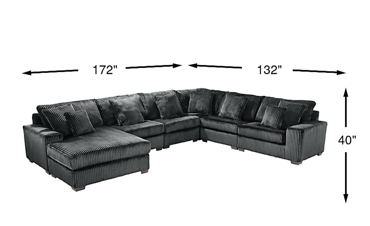 Runway inspiration meets unapologetic indulgence in Lexford Park, blending the poise of high fashion with the ease of everyday relaxation. Clad in ribbed black corduroy, this slightly U-shaped sectional commands attention with a sweeping configuration anchored by a left arm facing chaise that offers the perfect spot to stretch out in style. Whether you are unwinding solo or gathering with friends and family, the generous seat depth provides ample space to sink into comfort with ease. Low profile track arms cinch the look with a subtle contemporary edge that adds a chic detail to the breathtaking silhouette. Reversible back and seat cushions refresh effortlessly, keeping the sectional as ready for its close-up as you are to relax. Upholstery: 100% Polyester. Cleaning Instructions: Use water-based cleaning agents or foam. Accent pillows not included.