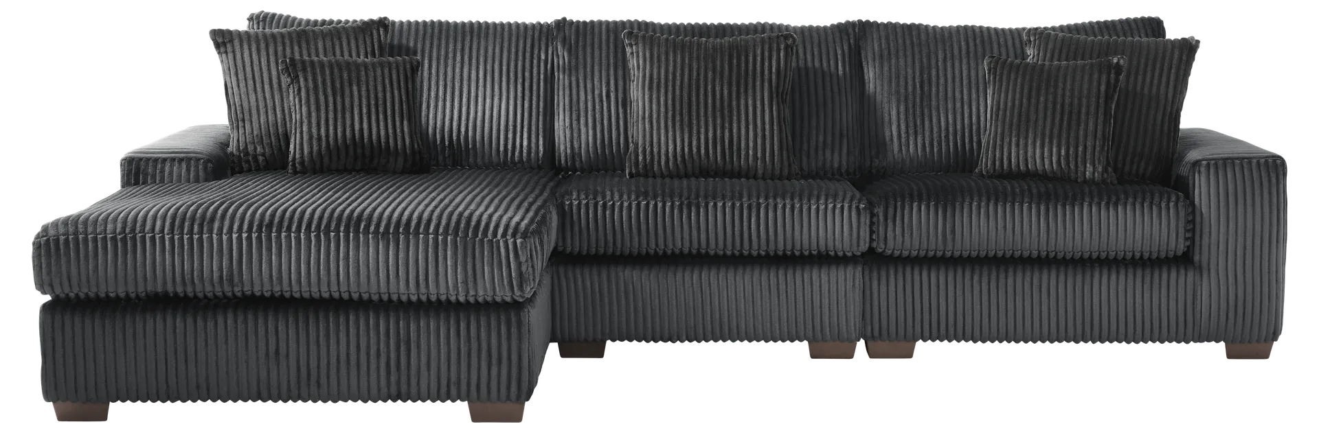 Runway inspiration meets unapologetic indulgence in Lexford Park, blending the poise of high fashion with the ease of everyday relaxation. Clad in ribbed black corduroy, this slightly U-shaped sectional commands attention with a sweeping configuration anchored by a left arm facing chaise that offers the perfect spot to stretch out in style. Whether you are unwinding solo or gathering with friends and family, the generous seat depth provides ample space to sink into comfort with ease. Low profile track arms cinch the look with a subtle contemporary edge that adds a chic detail to the breathtaking silhouette. Reversible back and seat cushions refresh effortlessly, keeping the sectional as ready for its close-up as you are to relax. Upholstery: 100% Polyester. Cleaning Instructions: Use water-based cleaning agents or foam. Accent pillows not included.