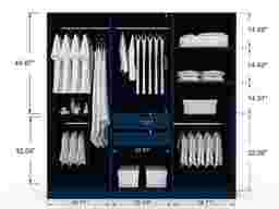 The Lifehive blue storage cabinet is as sleek and sophisticated outside as it is on the inside. Complete your bedroom space with this storage closet and keep all your clothing organized in style. Crafted to perfection and built to last, this piece features two upper and lower hanging rods perfect for hanging dresses, skirts, and pants, and plenty of shelf space, and a pair of drawers to tuck away socks and personal items. Beautiful doors with sleek hardware conceal all your items to function as a statement piece that will last for years to come. Customer assembly is required.