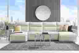 The indulgent luxury of Madison Avenue comes home with sumptuous top grain leather in the dual power ModularTwo, the perfect blend of sophistication and opulent comfort. Our first modular collection featuring top grain leather upholstery where the body touches, this contemporary seating solution is enhanced by welted track arms and tufted back cushions for a look of refined elegance and serenity. Each piece is upholstered on all sides, offering endless opportunities for both reconfiguration as well as individual use. Dual power reclining functionality allows for easy adjustment in the headrest and footrest, providing personalized comfort. Select a preconfigured design or visit a showroom to learn about individual components and create the modular solution perfect for your space and style. Includes LAF chaise, 2 stationary armless seats and RAF chaise. Upholstery: Top grain leather where the body touches and polyurethane fabric sides and backs. Leather is a durable, low maintenance product, however, general regular maintenance is necessary. To keep your leather clean, vacuum it regularly, removing any dust, and clean it with water and a mild non-detergent soap.