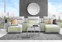 The indulgent luxury of Madison Avenue comes home with sumptuous top grain leather in the dual power ModularTwo, the perfect blend of sophistication and opulent comfort. Our first modular collection featuring top grain leather upholstery where the body touches, this contemporary seating solution is enhanced by welted track arms and tufted back cushions for a look of refined elegance and serenity. Each piece is upholstered on all sides, offering endless opportunities for both reconfiguration as well as individual use. Dual power reclining functionality allows for easy adjustment in the headrest and footrest, providing personalized comfort. The console includes a touch-activated reading light and swivel-top wood table with hidden storage for easy access to lounging essentials. Select a preconfigured design or visit a showroom to create the modular solution perfect for your space and style. Includes RAF seat, armless seat, 2 consoles and LAF chaise. Upholstery: Top grain leather where the body touches and polyurethane fabric sides and backs. Leather is a durable, low maintenance product, however, general regular maintenance is necessary. To keep your leather clean, vacuum it regularly, removing any dust, and clean it with water and a mild non-detergent soap.