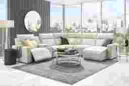 The indulgent luxury of Madison Avenue comes home with sumptuous top grain leather in the dual power ModularTwo, the perfect blend of sophistication and opulent comfort. Our first modular collection featuring top grain leather upholstery where the body touches, this contemporary seating solution is enhanced by welted track arms and tufted back cushions for a look of refined elegance and serenity. Each piece is upholstered on all sides, offering endless opportunities for both reconfiguration as well as individual use. Dual power reclining functionality allows for easy adjustment in the headrest and footrest, providing personalized comfort. The console includes a bluetooth-enabled sound system, retracting cupholders and wireless charging. Select a preconfigured design or visit a showroom to create the modular solution perfect for your space and style. Includes LAF seat, stationary armless seat, reclining armless seat, media console, wedge and RAF chaise. Upholstery: Top grain leather where the body touches and polyurethane fabric sides and backs. Leather is a durable, low maintenance product, however, general regular maintenance is necessary. To keep your leather clean, vacuum it regularly, removing any dust, and clean it with water and a mild non-detergent soap.