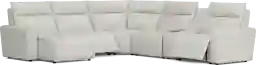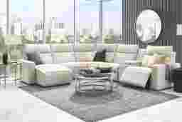 The indulgent luxury of Madison Avenue comes home with sumptuous top grain leather in the dual power ModularTwo, the perfect blend of sophistication and opulent comfort. Our first modular collection featuring top grain leather upholstery where the body touches, this contemporary seating solution is enhanced by welted track arms and tufted back cushions for a look of refined elegance and serenity. Each piece is upholstered on all sides, offering endless opportunities for both reconfiguration as well as individual use. Dual power reclining functionality allows for easy adjustment in the headrest and footrest, providing personalized comfort. The console includes a bluetooth-enabled sound system, retracting cupholders and wireless charging. Select a preconfigured design or visit a showroom to create the modular solution perfect for your space and style. Includes LAF chaise, stationary armless seat, reclining armless seat, media console, wedge and RAF seat. Upholstery: Top grain leather where the body touches and polyurethane fabric sides and backs. Leather is a durable, low maintenance product, however, general regular maintenance is necessary. To keep your leather clean, vacuum it regularly, removing any dust, and clean it with water and a mild non-detergent soap.