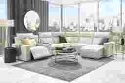 The indulgent luxury of Madison Avenue comes home with sumptuous top grain leather in the dual power ModularTwo, the perfect blend of sophistication and opulent comfort. Our first modular collection featuring top grain leather upholstery where the body touches, this contemporary seating solution is enhanced by welted track arms and tufted back cushions for a look of refined elegance and serenity. Each piece is upholstered on all sides, offering endless opportunities for both reconfiguration as well as individual use. Dual power reclining functionality allows for easy adjustment in the headrest and footrest, providing personalized comfort. The console includes a touch-activated reading light and swivel-top wood table with hidden storage for easy access to lounging essentials. Select a preconfigured design or visit a showroom to create the modular solution perfect for your space and style. Includes LAF seat, stationary armless seat, reclining armless seat, console, wedge and RAF chaise. Upholstery: Top grain leather where the body touches and polyurethane fabric sides and backs. Leather is a durable, low maintenance product, however, general regular maintenance is necessary. To keep your leather clean, vacuum it regularly, removing any dust, and clean it with water and a mild non-detergent soap.
