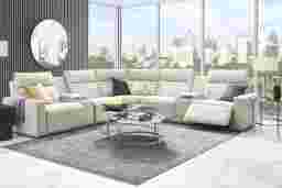 The indulgent luxury of Madison Avenue comes home with sumptuous top grain leather in the dual power ModularTwo, the perfect blend of sophistication and opulent comfort. Our first modular collection featuring top grain leather upholstery where the body touches, this contemporary seating solution is enhanced by welted track arms and tufted back cushions for a look of refined elegance and serenity. Each piece is upholstered on all sides, offering endless opportunities for both reconfiguration as well as individual use. Dual power reclining functionality allows for easy adjustment in the headrest and footrest, providing personalized comfort. Each console includes a bluetooth-enabled sound system, retracting cupholders and wireless charging. Select a preconfigured design or visit a showroom to create the modular solution perfect for your space. Includes LAF seat, stationary armless seat, reclining armless seat, wedge, 2 media consoles and RAF seat. Upholstery: Top grain leather where the body touches and polyurethane fabric sides and backs. Leather is a durable, low maintenance product, however, general regular maintenance is necessary. To keep your leather clean, vacuum it regularly, removing any dust, and clean it with water and a mild non-detergent soap.