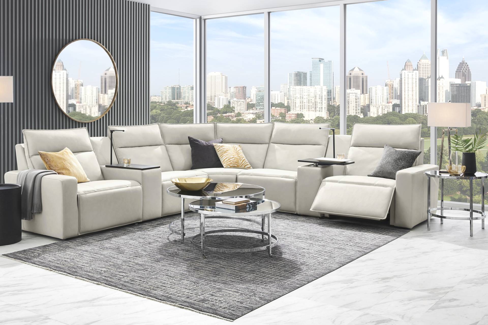 The indulgent luxury of Madison Avenue comes home with sumptuous top grain leather in the dual power ModularTwo, the perfect blend of sophistication and opulent comfort. Our first modular collection featuring top grain leather upholstery where the body touches, this contemporary seating solution is enhanced by welted track arms and tufted back cushions for a look of refined elegance and serenity. Each piece is upholstered on all sides, offering endless opportunities for both reconfiguration as well as individual use. Dual power reclining functionality allows for easy adjustment in the headrest and footrest, providing personalized comfort. Each console includes a touch-activated reading light and swivel-top wood table with hidden storage for easy access to lounging essentials. Select a preconfigured design or visit a showroom to create the modular solution perfect for your space. Includes LAF seat, stationary armless seat, reclining armless seat, wedge, 2 consoles and RAF seat. Upholstery: Top grain leather where the body touches and polyurethane fabric sides and backs. Leather is a durable, low maintenance product, however, general regular maintenance is necessary. To keep your leather clean, vacuum it regularly, removing any dust, and clean it with water and a mild non-detergent soap.