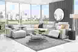 The indulgent luxury of Madison Avenue comes home with sumptuous top grain leather in the dual power ModularTwo, the perfect blend of sophistication and opulent comfort. Our first modular collection featuring top grain leather upholstery where the body touches, this contemporary seating solution is enhanced by welted track arms and tufted back cushions for a look of refined elegance and serenity. Each piece is upholstered on all sides, offering endless opportunities for both reconfiguration as well as individual use. Dual power reclining functionality allows for easy adjustment in the headrest and footrest, providing personalized comfort. Each console includes a touch-activated reading light and swivel-top wood table with hidden storage for easy access to lounging essentials. Select a preconfigured design or visit a showroom to create the modular solution perfect for your space. Includes LAF chaise, stationary armless seat, reclining armless seat, wedge, 2 consoles and RAF seat. Upholstery: Top grain leather where the body touches and polyurethane fabric sides and backs. Leather is a durable, low maintenance product, however, general regular maintenance is necessary. To keep your leather clean, vacuum it regularly, removing any dust, and clean it with water and a mild non-detergent soap.