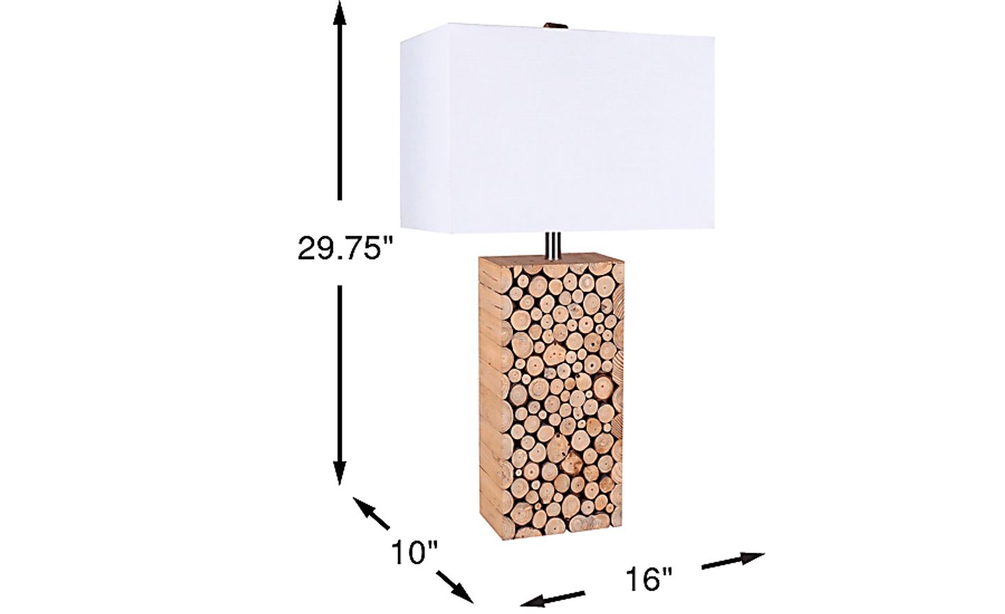 The Lillian Edge lamp adds a touch of unique style to your living or work space. A wood base features a log-like design that creates a forest-inspired look. Operated by a three-way switch, this lamp has a 100-watt bulb capacity.