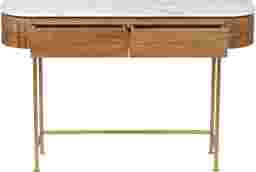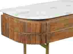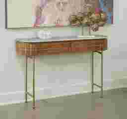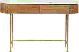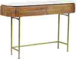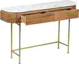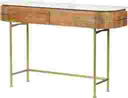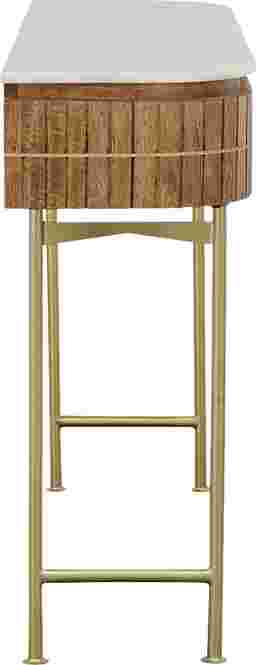 Welcome a splash of retro style into any space with this contemporary Linbard console table. Crafted from solid mango wood, it's frame features slender gold powder coated iron legs, and a warm brown finish for a natural touch. Above, the curved top sports a white marble top with unique gray veining creating contrast. Beyond decorative, this designs provides the perfect place to display photos and storage to keep your collection of keys all in one place. Customer assembly is required.