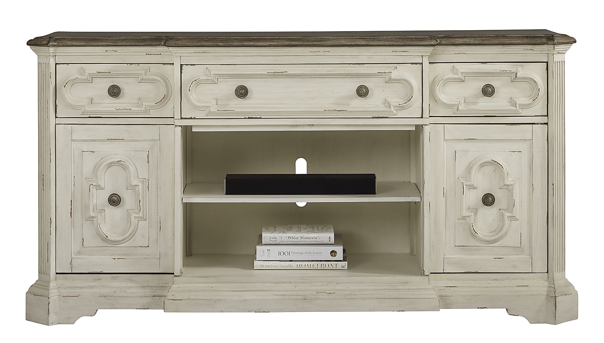 Store your TV and electronics in style with the Lindenwood console. This distinctive piece, made with wood solids, features three drawers and storage below with doors that can be positioned to conceal the center or the sides. The back panel has pass through holes for wire management. Each drawer is crafted with English dovetail joints for strength and stability. The front of each drawer and door is enhanced with shaped moulding detailing like those found on antique ceiling tiles. Made with wood solids and Mindi veneers on the top, the console has a shabby chic look crafted by textured white paint with brushed glazing and chip-away edges. The contrasting top and wooden knobs are rendered in a distressed wire brushed gray-brown finish.