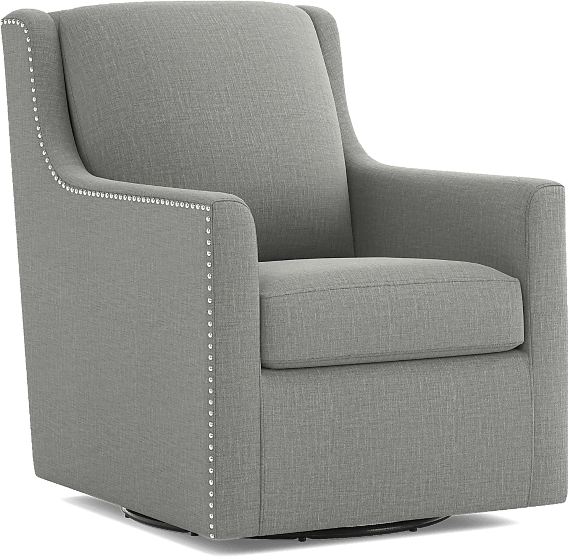 From cocktail hour in the den to reading before bed, is there a more stylish accent for your favorite room than the Lindsey swivel chair? Upholstered with soft woven fabric, the lush gray color of this piece is complimented by handsome flare arms. No matter if they catch your eye from the left or right, ornate silver polished nail head accents on each side of the chair add a captivating detail. You can even flip, reverse or remove the chair's plush seat cushion. The base, with a pivot motion feature, can swivel in a 360-degree rotation. Upholstery: 100% Polyester.