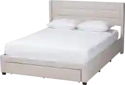Transform your bedroom into a harmonized haven with the beautiful and efficient Linnaean beige queen bed. This mid-century inspired piece consists of a sturdy wood frame padded with plush foam and upholstered in sumptuous fabric. Remarkably efficient, this sleek design accommodates modern needs with a wide drawer at the footboard as well as two additional drawers located at the sides. The Linnaean utilizes wood slats for mattress support, eliminating the need for a box spring. A channel tufted design nestled within the wingback headboard creates a gorgeous backdrop, making the Linnaean an exquisite bedroom centerpiece. Customer assembly is required.