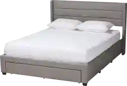 Transform your bedroom into a harmonized haven with the beautiful and efficient Linnaean light gray queen bed. This mid-century inspired piece consists of a sturdy wood frame padded with plush foam and upholstered in sumptuous fabric. Remarkably efficient, this sleek design accommodates modern needs with a wide drawer at the footboard as well as two additional drawers located at the sides. The Linnaean utilizes wood slats for mattress support, eliminating the need for a box spring. A channel tufted design nestled within the wingback headboard creates a gorgeous backdrop, making the Linnaean an exquisite bedroom centerpiece. Customer assembly is required.