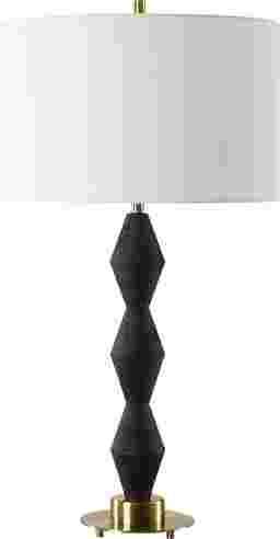 The Linville Grove Black Lamp is crafted from cast black man-made stone for a bold yet refined aesthetic. Its distinctive pitted surface adds character and texture, complemented by antique brass plated details for a touch of vintage allure. The round hardback drum shade is a crisp white linen fabric. Partial assembly may be required.