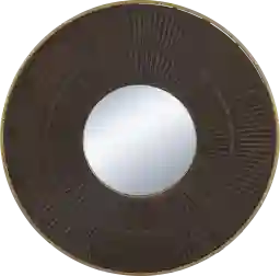 Framed in a striking gold iron, the Liotard brown wall mirror helps introduce a masculine accent to modern study. This round mirror features a rich brown wood base, contrasting the round mirror center. Carved parallel lines in the wood are defined by two rings, leading into the mirrored glass to complete the look.